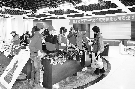 12月6日,浙江经贸职业技术学院的部分外来务工者欣喜地来到设在学生活动中心的“爱心捐衣送温暖”点,挑选、领取适合自己和家人的衣裤。学院党校志愿者们已将连日来师生们捐赠的794件衣物进行了统一消毒整理,部分直接赠送给校内的外来务工人员,其余部分则通过“杭州支点公益”统一运往西藏、青海等地,送到最需要的人们手里,而少数不适合再穿的衣裤,将被加工成拖把、抹布等进行义卖。