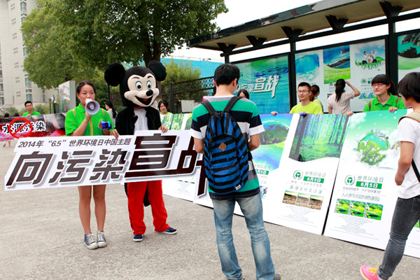 昨日中午,浙江经贸职业技术学院党校第51期培训班的学员们在校园里开展“6·5世界环境日——向污染宣战”主题活动,他们制作了宣传展板、印制了宣传卡片,还在同学们上课的必经之路上设置了几道“关卡”,路过的同学需回答出一个与环保相关的问题或喊出一句环保口号才能“通关”,以此形式倡导全校师生共同行动、保护环境,向污染宣战。