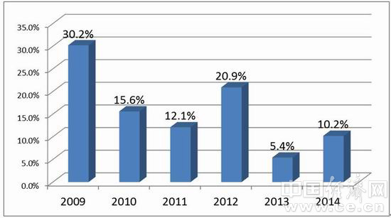 报告认为,在我国高校招生总量控制的大背景下,会展招生数仍延续上升势头。近年来,全国会展专业总招生人数的年增长率为:2009年30.2%,2010年15.6%,2011年12.1%,2012年20.9%, 2013年5.4%,2014年10.2%(图3)。
