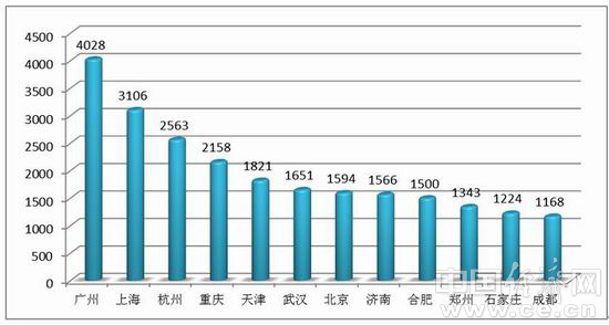 2014年, 全国229所会展院校分布在66个城市。其中会展专业在校生人数超过1000人的有12个城市,在校生首位城市由广州替代了上海,上海退居第二。3-12位依次是杭州、重庆、天津、武汉、北京、济南、合肥、郑州、石家庄、成都(图4)。12市在校生合计为23722人,占全国56.7%。其中教育规模超过2000人的广州、上海、杭州、重庆4市,就占了全国的1/3(32.7%)。